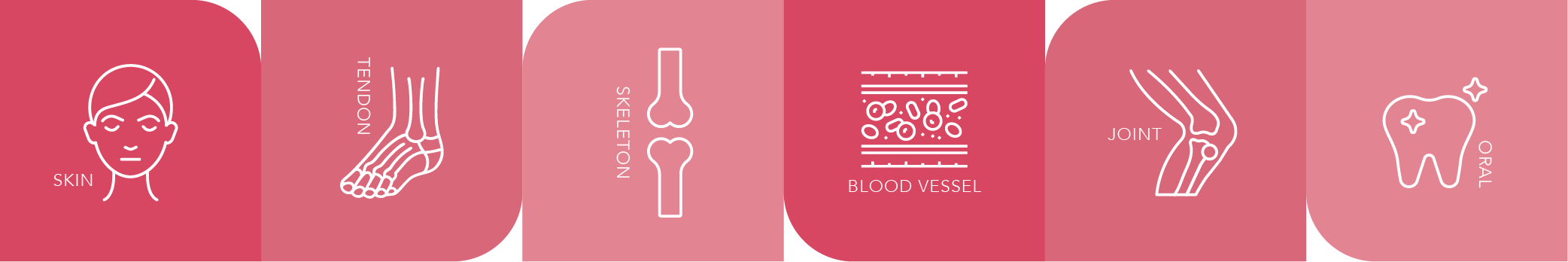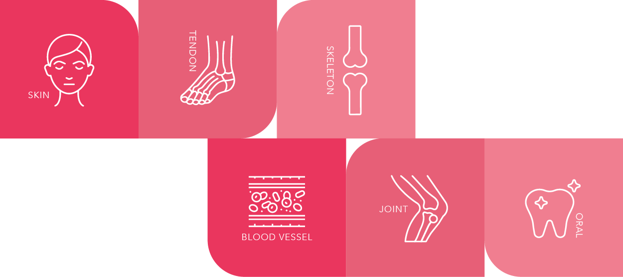 由研究顯示,膠原三肽活化引導身體在結締組織中的特定細胞類型生成,從而合成人體所需的1型至28型膠原蛋白,為皮膚、骨骼、關節及器官提供功能性益處。